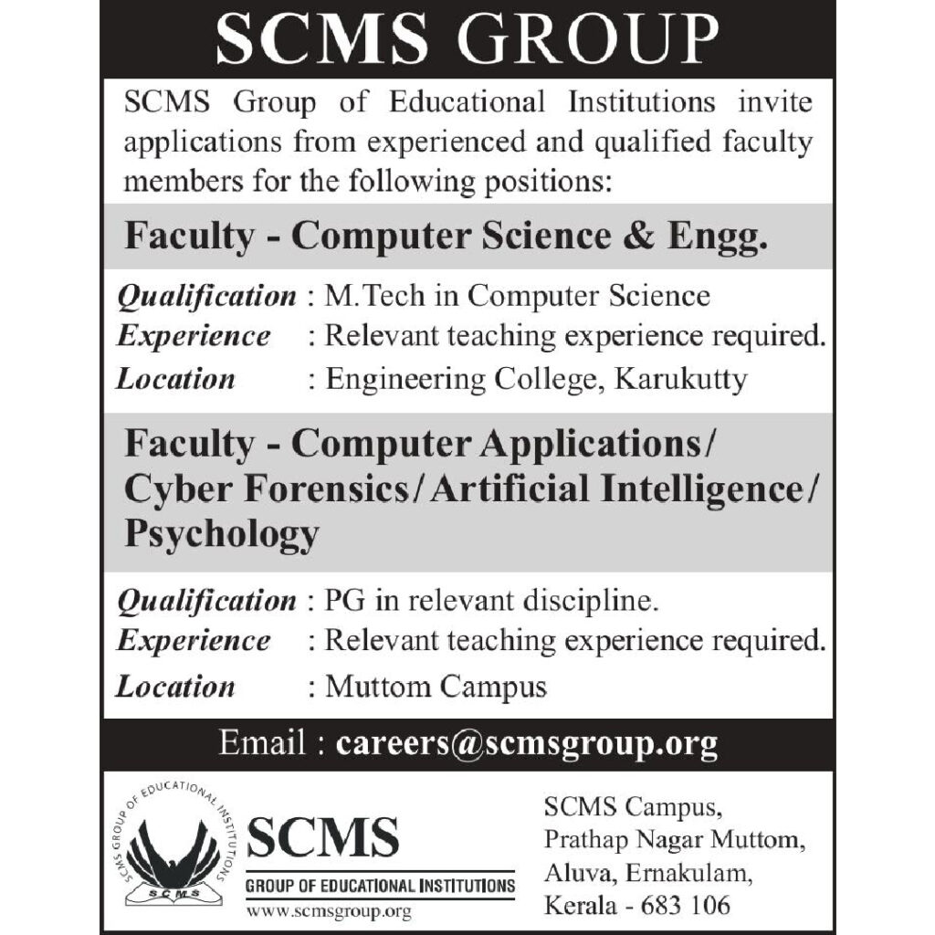 SCMS Group of Educational Institutions Invites Applications for Faculty Positions