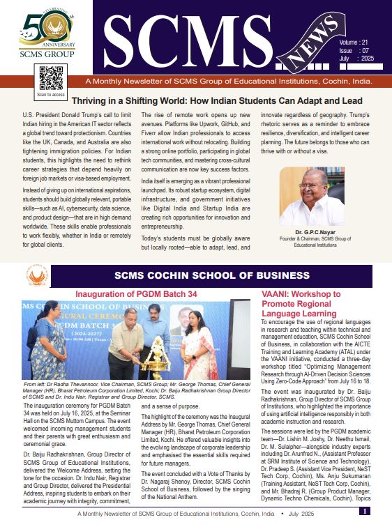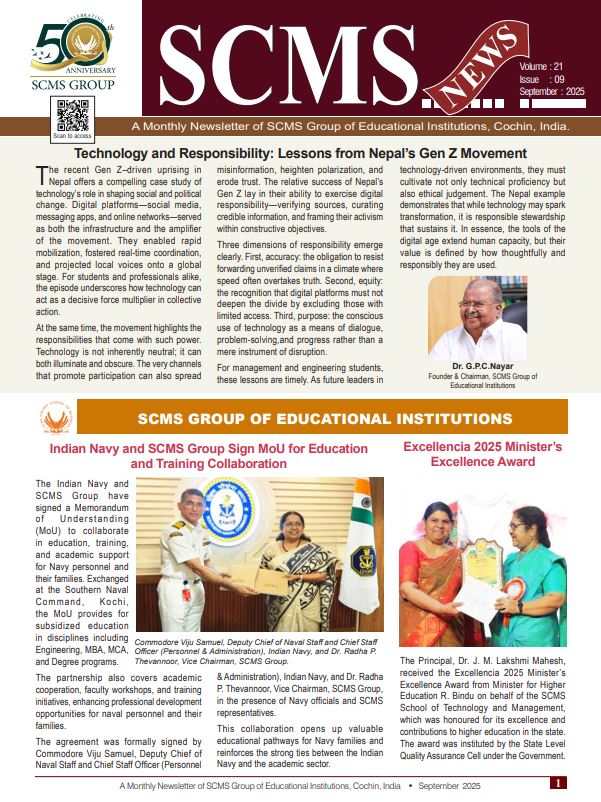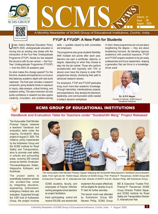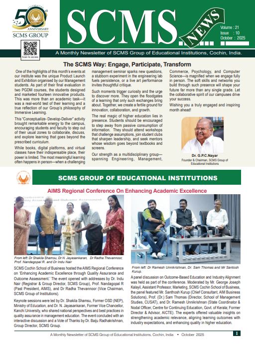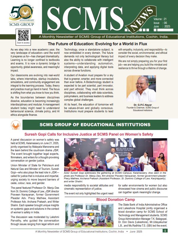 The SCMS Newsletter serves as a comprehensive monthly report highlighting the diverse activities, accomplishments, and initiatives of the educational institutions within the SCMS group. These institutions include the SCMS Cochin School of Business, SCMS School of Engineering and Technology, SCMS School of Technology and Management, SCMS School of Architecture, SCMS College of Polytechnics, SCMS School of International Studies , SCMS Institute for Road Safety and Transportation, and SCMS Water Institute.