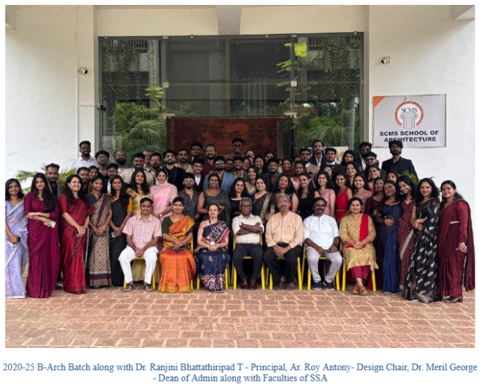 The farewell ceremony for the 2020–2025 Batch was held on 22nd August 2025 at the Seminar Hall, SSA. The program featured heartfelt speeches, cultural performances, and nostalgic reflections, creating a warm and memorable tone. Faculty and juniors extended their best wishes, while the outgoing students expressed gratitude and shared memories of their journey. The event concluded with tokens of appreciation, marking a memorable send-off to the graduating batch The event truly celebrated the spirit of unity, learning, and growth at SSA. The program was coordinated by Ar. Subha V. C. and Ar. Nikhil Jo Jacob, whose efforts ensured the smooth and successful conduct of the event.