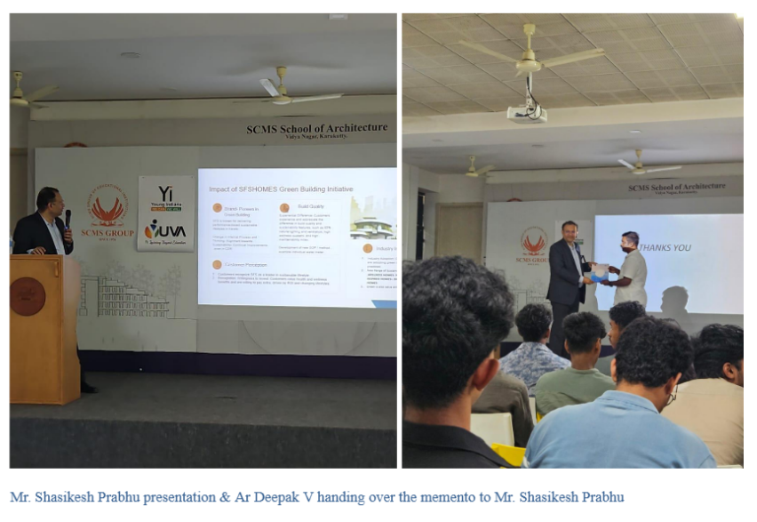 On 6th October 2025, Mr. Shashikesh Prabhu, Vice President of SFS Homes, delivered an inspiring session titled “Beyond Building – Architecture as a Catalyst for Environmental Responsibility.” Organized in association with YUVA, the session focused on the vital role of architects in fostering sustainability and environmental stewardship.Mr. Prabhu shared his rich experiences with IGBC (Indian Green Building Council) and green building practices, highlighting the importance of integrating environmental consciousness into every stage of design. The talk reminded students and faculty that architecture is not merely about creating structures, but about embracing responsibility, care, and a commitment to shaping a sustainable future for generations to come.
